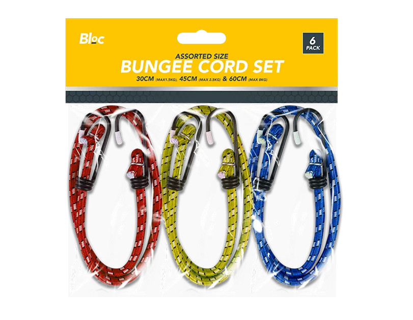 This Bungee Cord set contains six pieces that are constructed of robust elastic material and complete with metal end hooks. Each assorted pack contains colour coded load capabilities.