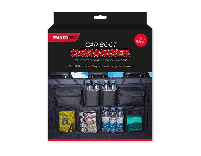 Easy to install with adjustable straps, these organisers will fit 99% of cars. Each organiser measures H46 x W87cm, and features 4x mesh pockets, 2x open pockets and 2x velcro close compartments. Secures onto back seat using velcro and plastic buckles. Wipe clean only.