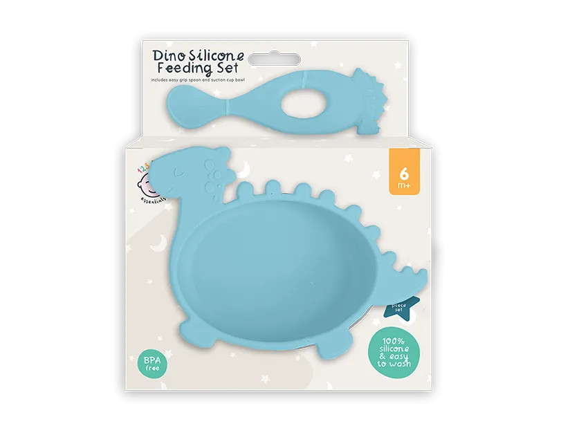 Dino silicone feeding set, includes an easy grip spoon and suction cup bowl to stop spillages. 100% silicone & easy to wash. BPA free.