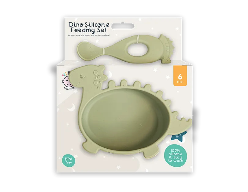 Dino silicone feeding set, includes an easy grip spoon and suction cup bowl to stop spillages. 100% silicone & easy to wash. BPA free.