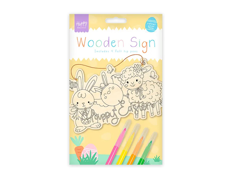 Each pack comes with a wooden sign that features a fun easter themed design and a hanging rope, and four felt tip pens in an assortment of colours.