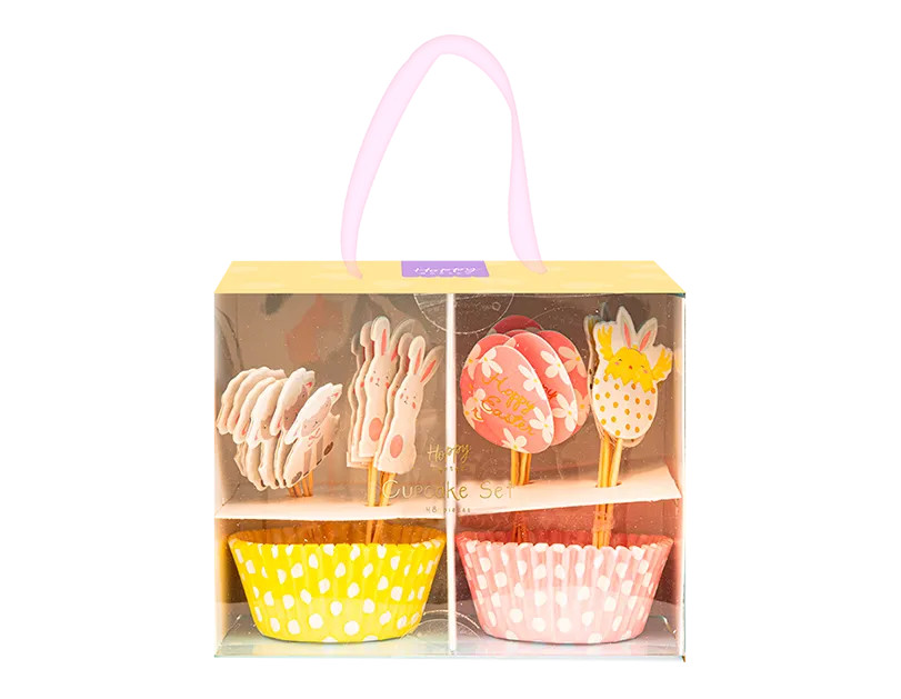 Each cupcake set comes with 24 cupcake cases designed with pastel colours and a polka dot pattern, and 24 cake toppers with four character designs mounted onto cocktail sticks; six each of easter eggs, bunnies, lambs and chicks.