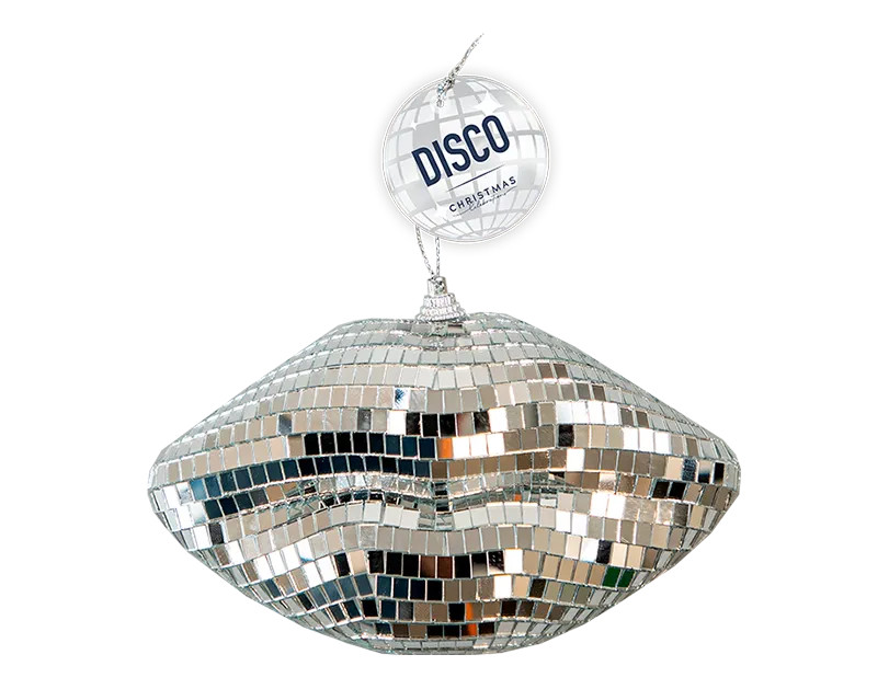 This disco ball themed pair of lips measures L8.5 x W15cm and is complete with a plastic bauble topper and silver hanging string.