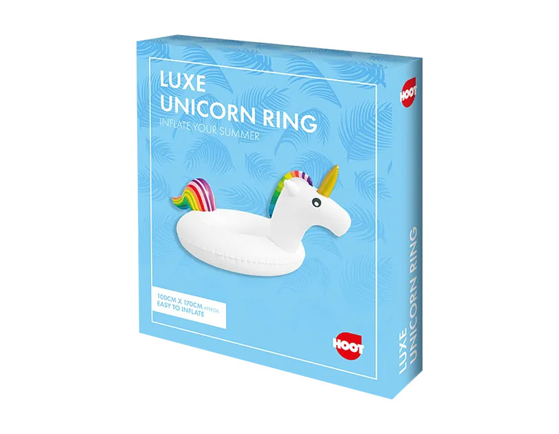 Luxury unicorn inflatable rubber ring. Includes 1x repair patch, two air valves and is constructed from stong and durable PVC.