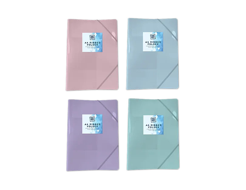 Each folder measures L32 x W24.5cm (folded), constructed from coloured plastic with rounded edges and a ribbed texture, and features elasticated straps on either end. Internal pocket helps to keep papers in place.