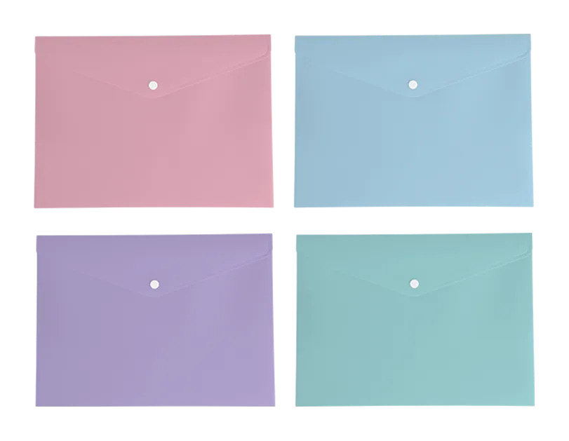 This pack of A4 Document Wallets contains four individual wallets. Each wallet features a flip over closing flap with a press stud fastener to keep documents secure inside. Constructed from plastic and measuring L24 x W33cm each.
