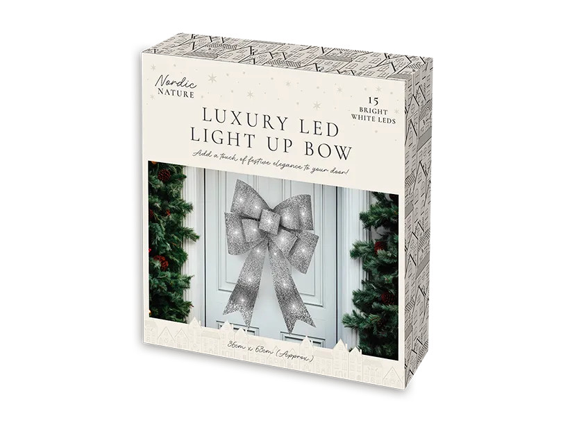 Featuring 15 bright white LED's, this decorative bow measures L63 x W36cm approx in a shimmering silver finish, creating an inviting festive atmosphere both indoors and outdoors.