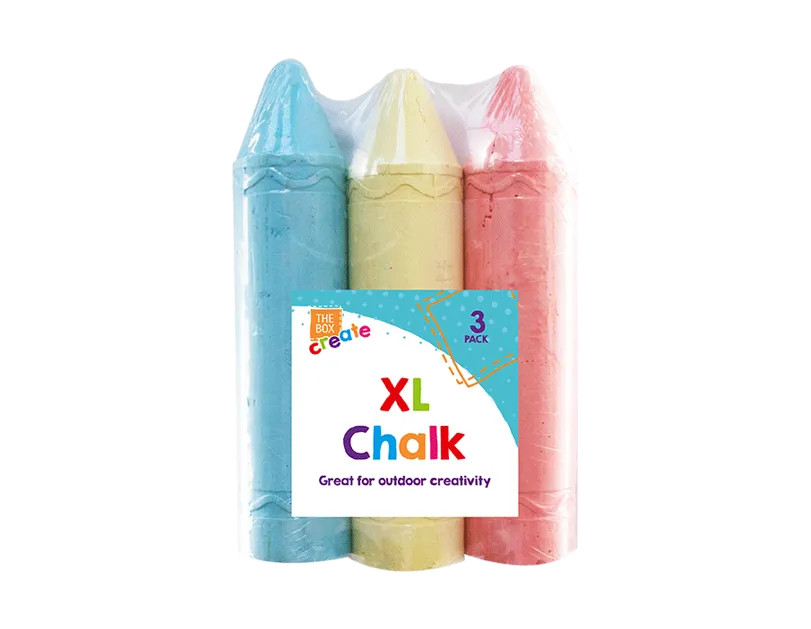 This pack of XL Chalk contains three pieces of chalk that measure a massive 19.5cm in length. The chalk is great for outdoor creativity and includes one blue, one yellow and one pink colour.
